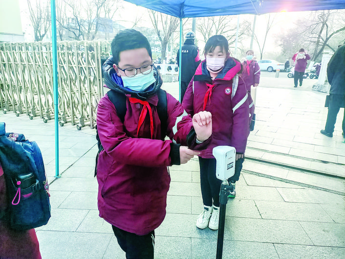 昨日,淮安市中小学正式开学,各学校严格执行疫情防控措施,确保师生安全。图为市区一小学学生经过红外测温系统测温后进入校园。通讯员 侯育永...