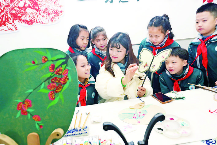 剪纸、纸扇、绢花……11月10日,非遗项目代表性传承人走进校园,展示非遗代表作品、演示传统技艺、教授制作工艺,让孩子们在面对面交流中体验非遗魅力。图为纸扇艺术非遗代表性传承人胡丹丹在讲解扇面制作方法。...
